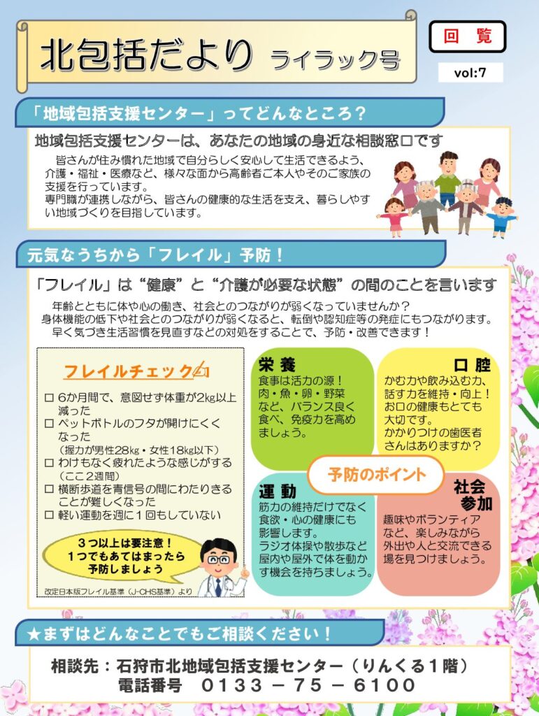広報誌「北包括だより」vol.7ライラック号を発行しました 2025/11/21 広報誌 介護予防や高齢者の権利を守るお話など、介護に役立つお話をお届けします。 今回は「フレイル予防」に関するお話です。