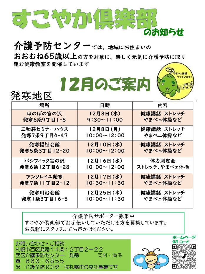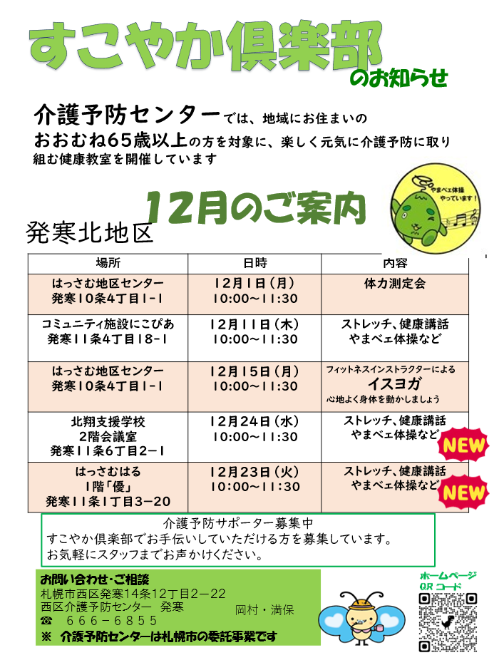 今月は、新たに発寒11条1丁目のはっさむはるさん内 発寒11条6丁目の北翔支援学校さん内でもすこやか倶楽部を開始します。いままでちょっと遠くて足を運びづらかった方も、どうぞお気軽にいらしてくださいね。